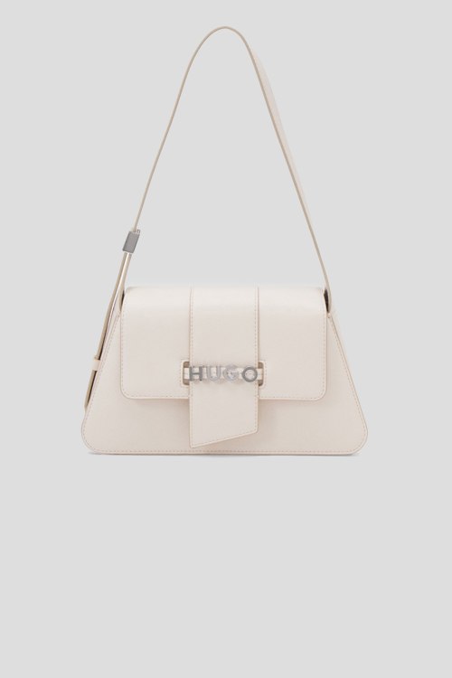 Детали: Женская кремовая сумка на плечо из экокожи от Hugo by Hugo Boss (Хуго бай Хуго Босс). Металлический логотип, серебристая фурнитура, плечевой ремень, застежка на магнит, одно отделение