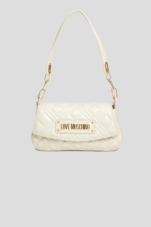 Детали: Женская сумка на плечо молочного оттенка из экокожи от Love Moschino (Лав Москино). Стеганый дизайн, нашивка с логотипом, золотистая фурнитура, плечевой ремень с крупными кольцами, застежка на магнит, одно отделение. Размеры: 26,5 х 14 х 6 см