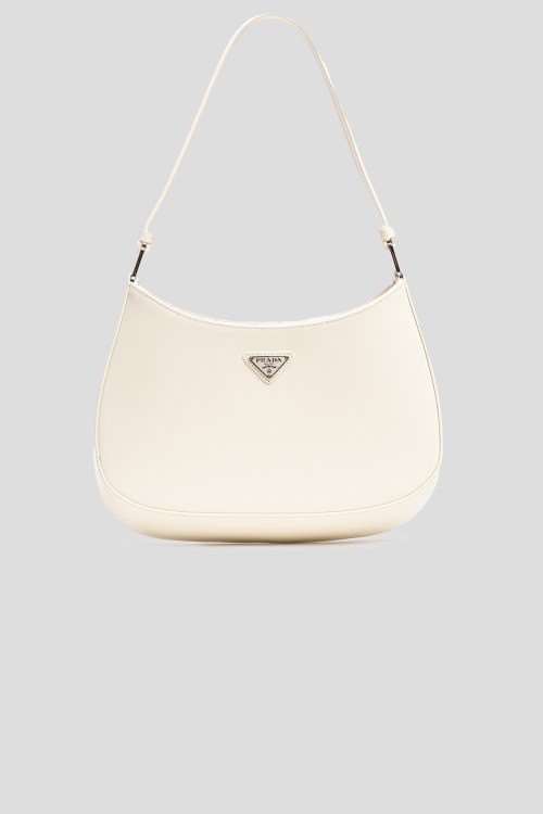 Детали: Женская кожаная сумка на плечо молочного оттенка Cleo от Prada (Прада). Модель из гладкой кожи, значок с логотипом, серебристая фурнитура, застежка на магнит, одно отделение, плечевой ремень. Комплектация: коробка и пыльник. Размеры: ширина - 26,5 см; высота - 18 см; глубина - 3,5 см