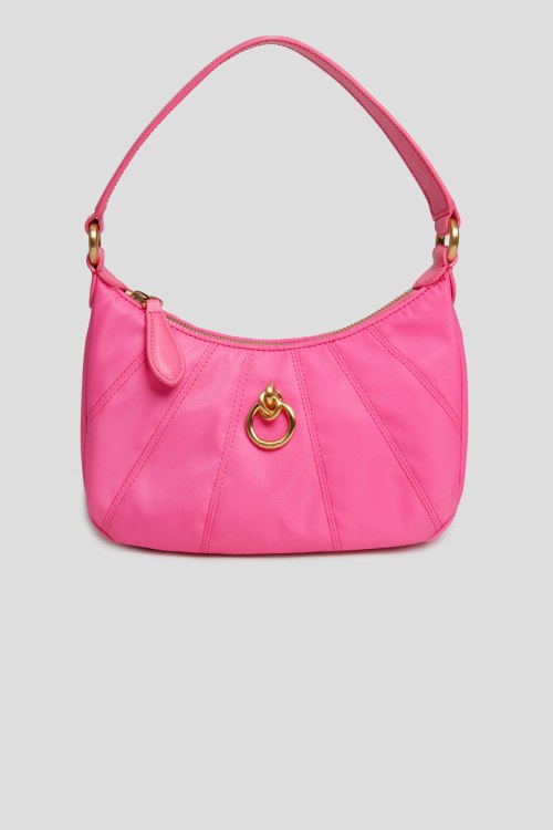 Женская розовая сумка Mini Love Bag Half Moon из текстиля от Pinko (Пинко). Модель на одно отделение, застежка на молнию, не съемная ручка, внутренний карман на молнии, металлическая фурнитура золотистого цвета. Размер: 14*23*6 см