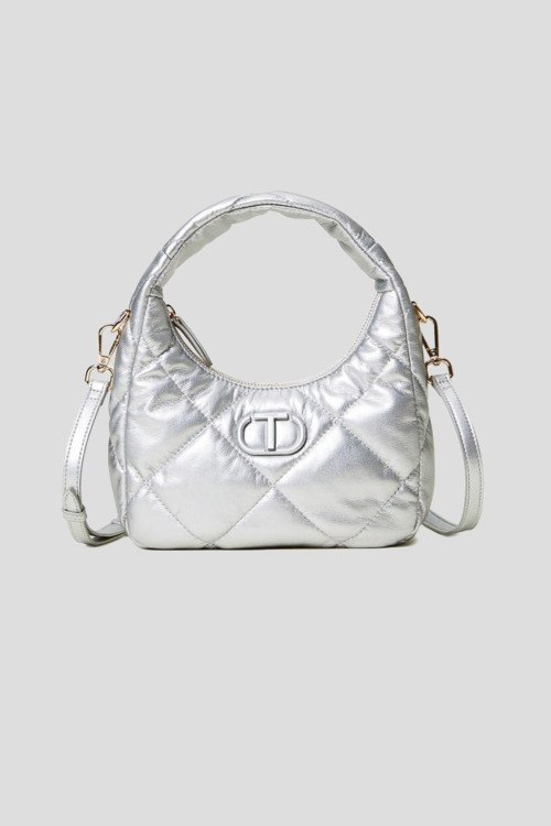 Детали: Женская серебристая сумка из полиуретана от TWINSET (Твинсет). Стеганый дизайн, застежка на молнию, верхняя ручка, логотип бренда в тон изделия, съемный тонкий плечевой ремень. Измерения: ширина 22 см, высота 13 см, глубина 5,5 см. Длина ручки 16 см. Длина плечевого ремня 54 см.