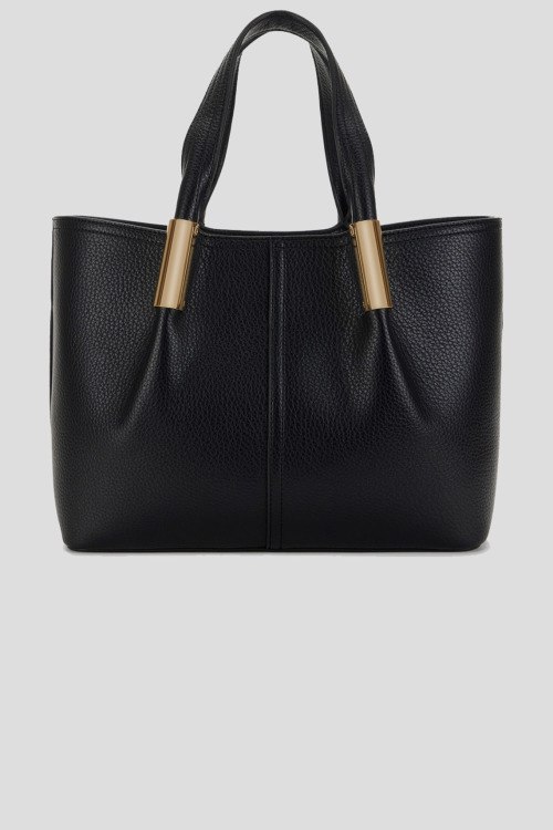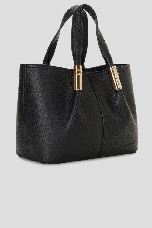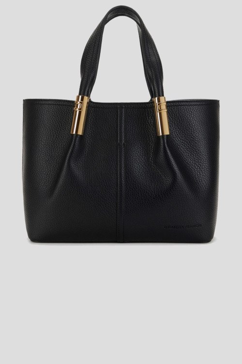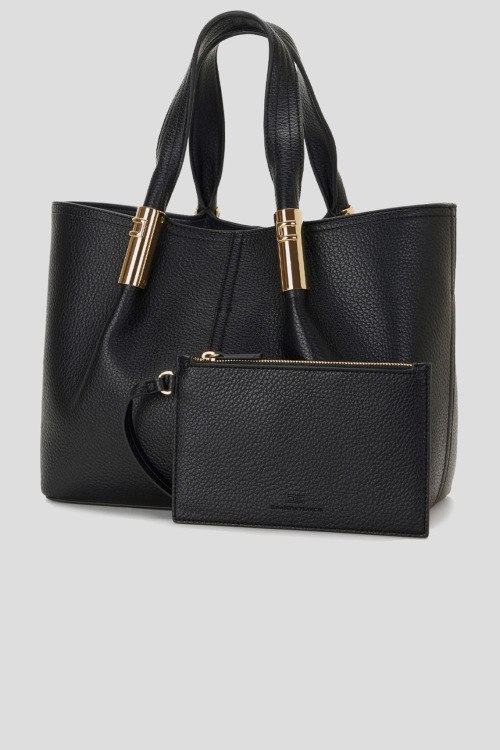 Женская черная сумка-шоппер из экокожи от Elisabetta Franchi (Елизабетта Франчи). Модель из зернистой кожи, золотистая фурнитура с логотипом, две круглые ручки, без застежки, внутренний кошелек, одно отделение. Размеры: высота 25 см, ширина 32 см, глубина 18 см
