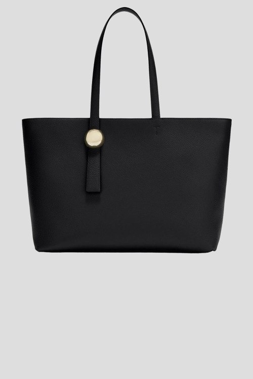 Детали: Женская черная кожаная сумка-шоппер Sfera от Furla (Фурла). Модель из зернистой кожи, золотистая фурнитура, две ручки, застежка-молния, одно отделение. Размер: 35,5 х 28 х 13 см