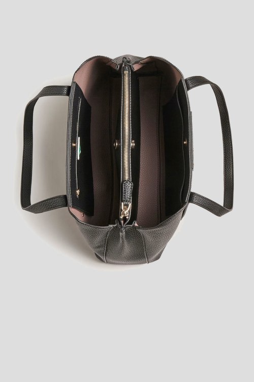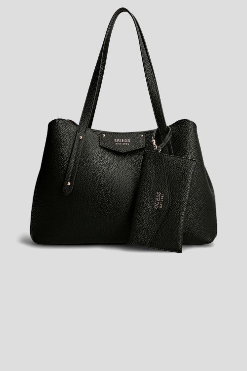 Детали: Женская черная сумка-шоппер из экокожи Brenton от Guess (Гесс). Модель из зернистой кожи, значок с логотипом, съемная косметичка, две ручки, застежка на магнит, два внутренних отделения, один внутренний карман на молнии, пыльник. Размер: 36/39x27x12,5 см, высота ручки/ремня: 22 см (производитель не комплектует пыльниками кошельки и маленькие сумки)