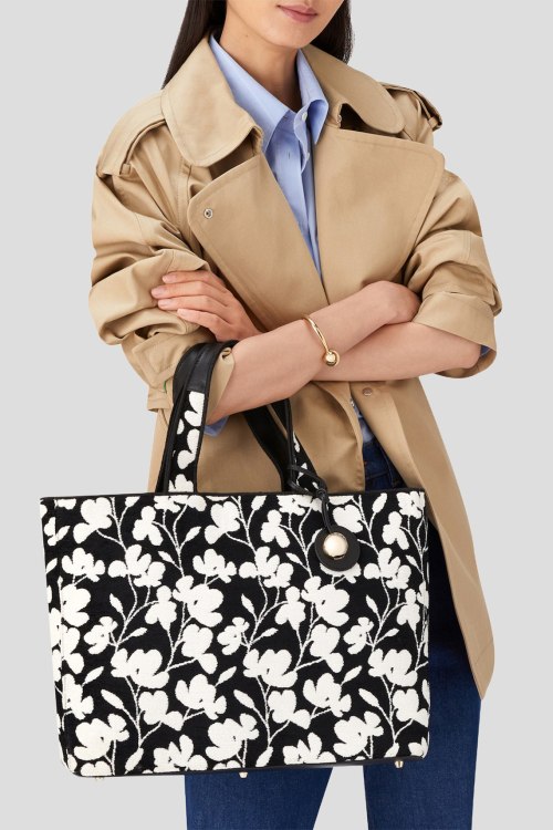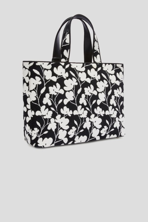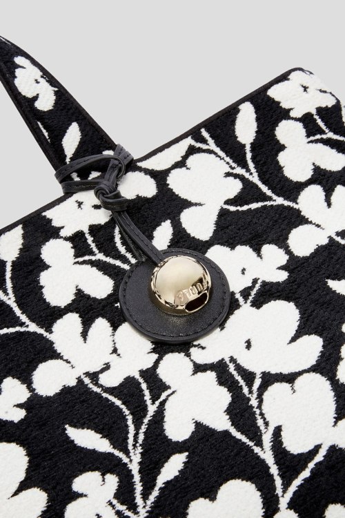 Детали: Женская черно-белая текстильная сумка-шоппер Alissa от Furla (Фурла). Цветочный узор, подвеска с логотипом, золотистая фурнитура, две круглые ручки, застежка-молния, одно отделение. Размеры: 36,5 x 28,5 x 13,7 см