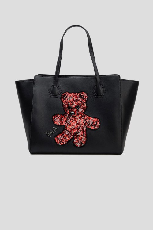 Женская черная сумка-шоппер из натуральной кожи от Philipp Plein (Филипп Плейн). Одно отделение без застежки, две кожаные ручки и съемный плечевой ремень-цепочка, внутри карман на молнии, сатиновая подкладка. Спереди декор TEDDY BEAR с кристаллами. Размер: длина 52-34 см, высота 29 см