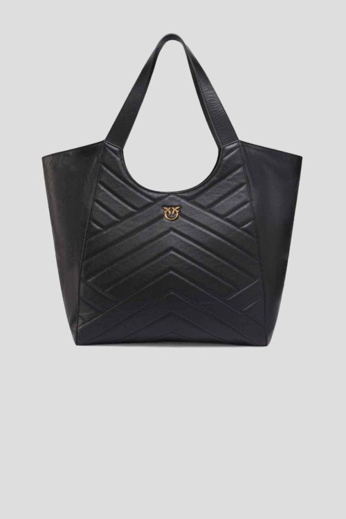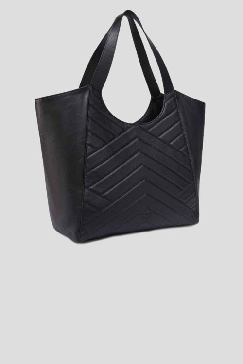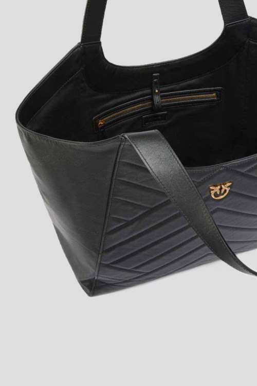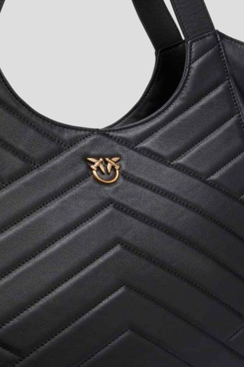 Детали: Женская черная кожаная сумка-шоппер Puzzle от Pinko (Пинко). Модель из мягкой кожи со стеганым шевронным узором украшена миниатюрной металлической эмблемой в виде птиц Love Birds Diamond Cut. Вместительное внутреннее отделение на подкладке из поликоттона дополнено практичным плоским карманом на молнии. Благодаря двум верхним ручкам из кожи модель удобно носить в руке. Размеры: высота: 42 см, ширина: 15 см, длина: 36 см