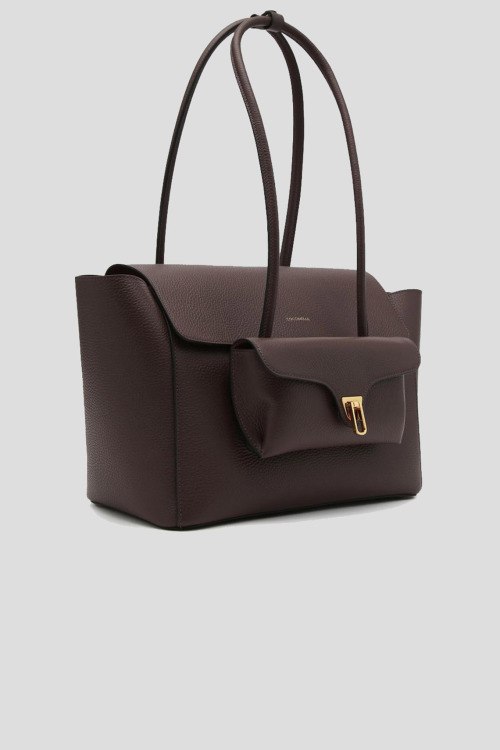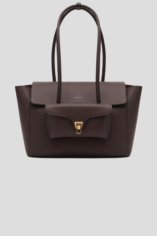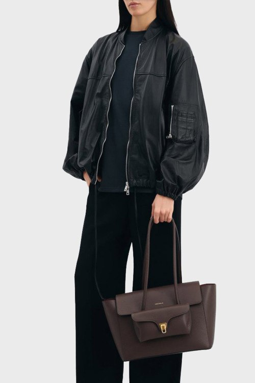 Детали: Женская коричневая кожаная сумка-шоппер Double Beat от Coccinelle (Кочинелле). Модель из зернистой кожи, логотип спереди, золотистая фурнитура, отстегивающийся карман-клапан с дополнительной цепочкой, две ручки, откидной клапан с застежкой на магнит, одно отделение. Размеры: 44 x 23 x 17 см