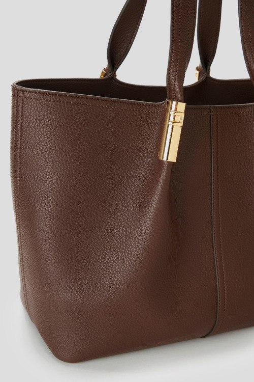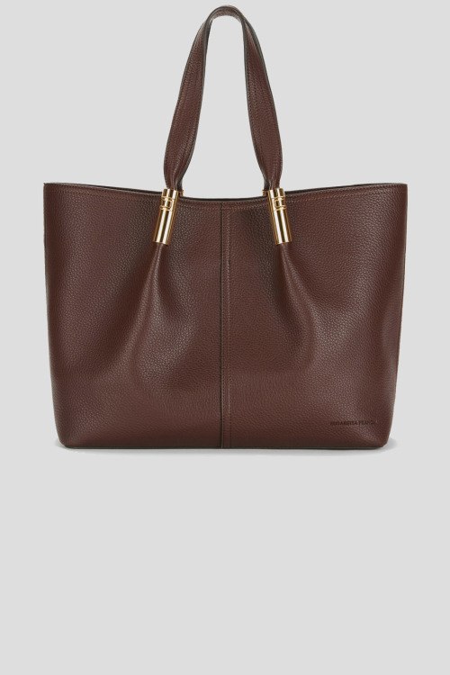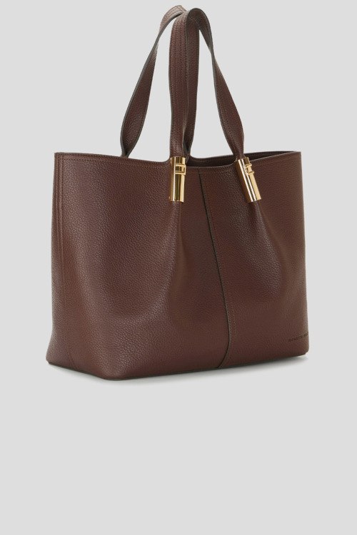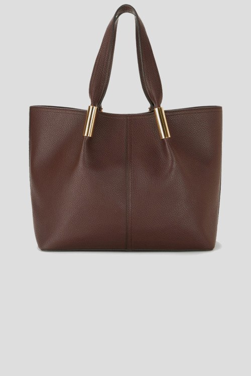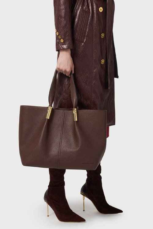 Женская темно-коричневая сумка-шоппер из экокожи от Elisabetta Franchi (Елизабетта Франчи). Модель из зернистой кожи, золотистая фурнитура с логотипом, две круглые ручки, без застежки, внутренний кошелек, одно отделение. Размеры: высота 25 см, ширина 32 см, глубина 18 см