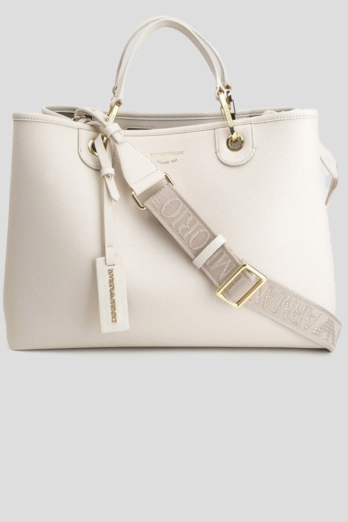Детали: Женская сумка-шоппер из экокожи молочного оттенка MyEA от Emporio Armani (Эмпорио Армани). Модель из зернистой кожи, принт с логотипом, подвеска с логотипом, две круглые ручки, брендированный плечевой ремень, застежка на магнит, внутренний кошелек, одно отделение. Размеры: 37.5 x 27 x 11.5 см