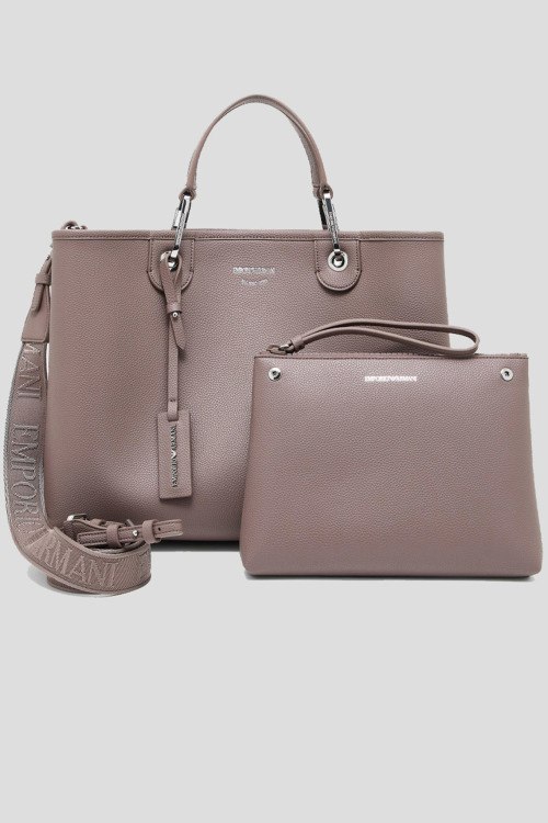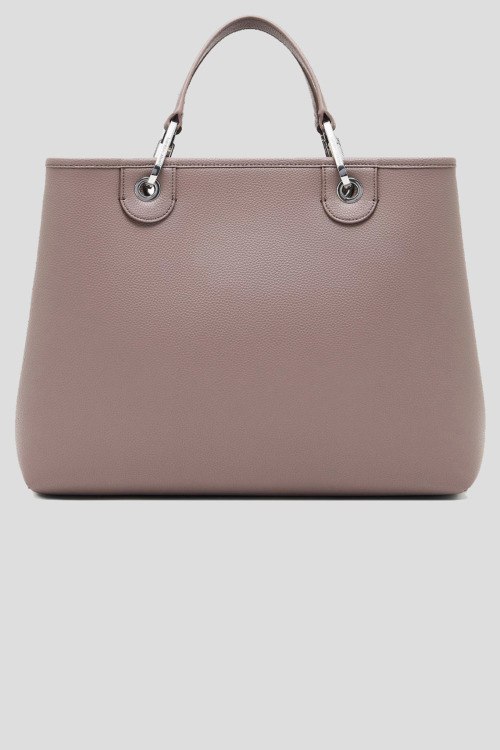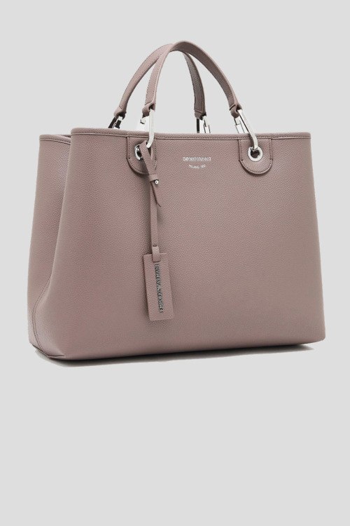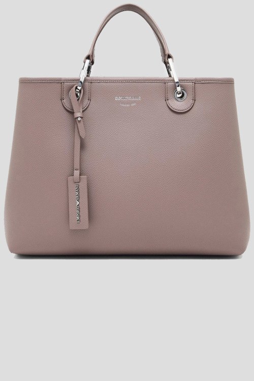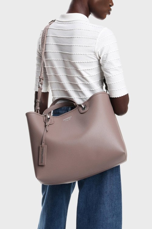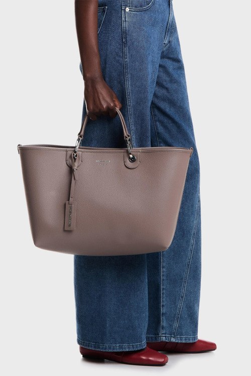 Детали: Женская сумка-шоппер из экокожи цвета тауп от Emporio Armani (Эмпорио Армани). Модель из зернистой кожи, тиснение логотипа, подвеска с логотипом, серебристая фурнитура, внутренний кошелек, две круглые ручки, съемный плечевой ремень, застежка на магнит, одно отделение. Размеры: 37,5 x 27 x 11,5 см