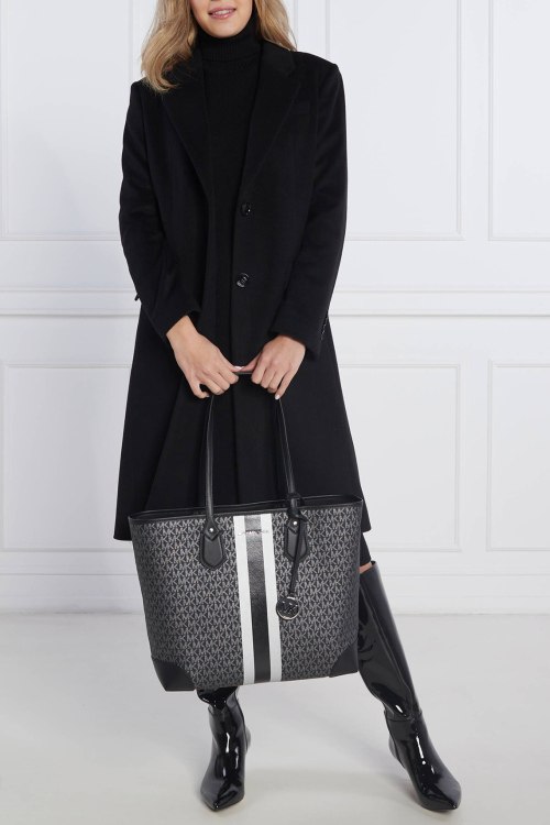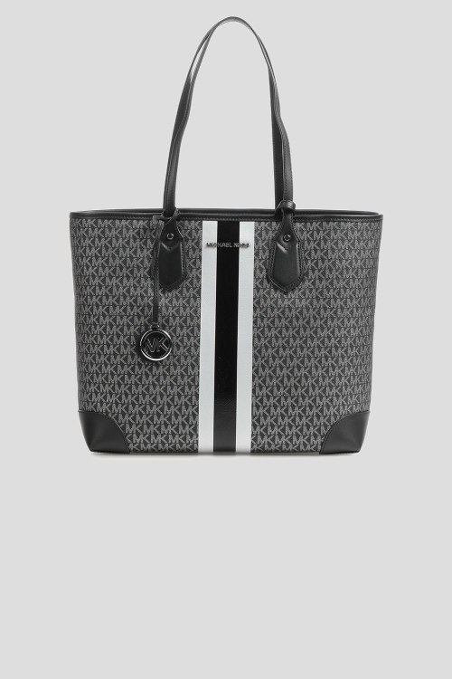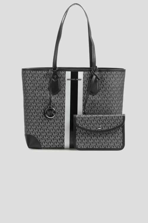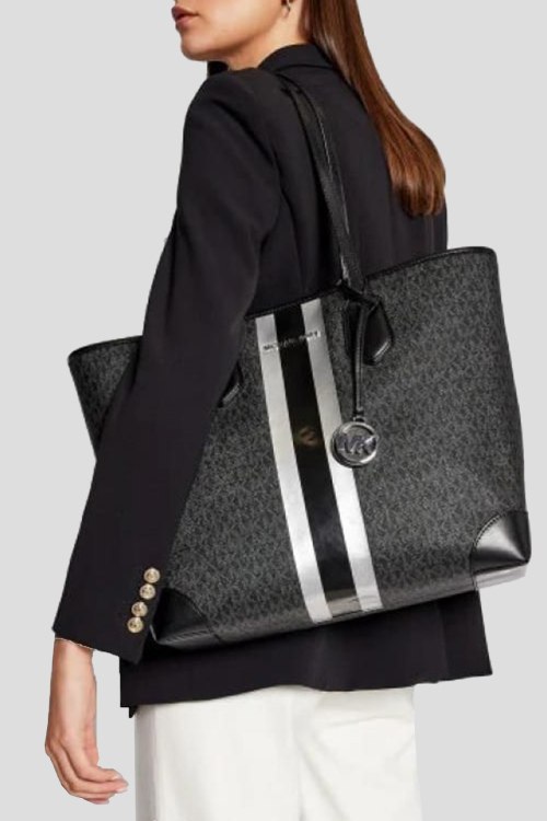 Детали: Женская темно-серая сумка- шоппер из экокожи от Michael Kors (Майкл Корс). Модель Lg Tote, без подкладки, серебристая фурнитура, без застежки, одно отделение, съемный фирменный брелок, монограмма по всей поверхности изделия. внутренний карман в виде съемной косметички. Размер: 36X32X13 см, высота ручки 27 см. Комплектация: транспортный Пэ Пакет, пыльник