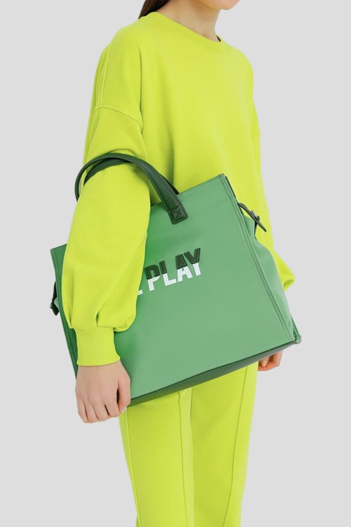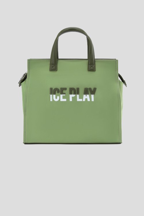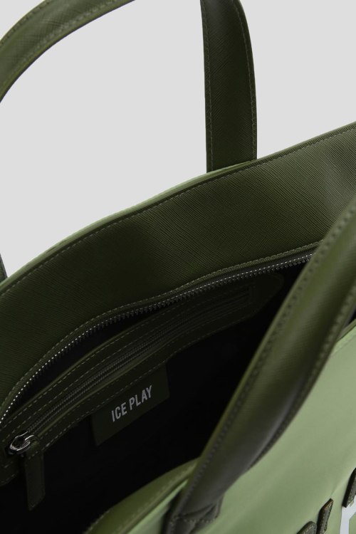 Женская оливковая текстильная сумка-шоппер от Ice Play (Айс Плей). Контрастный логотип, две круглые ручки, съемный плечевой ремень, застежка-молния, одно отделение. Размеры: 38 x 33 x 15 см