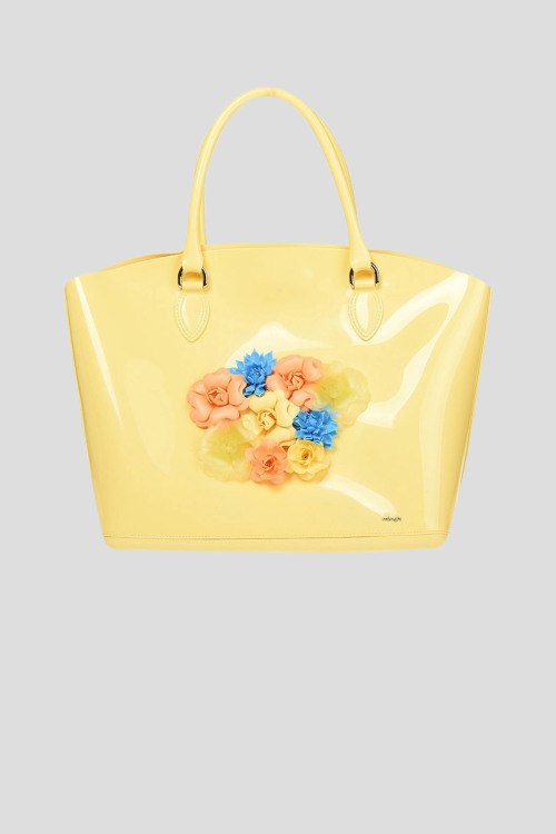 Детали: Женская желтая силиконовая сумка-шоппер от Menghi (Менги). Декор цветочной аппликацией, две круглые ручки, одно отделение. Размеры: высота: 31.5 см, ширина: 43.5 см, высота ручек: 18.5 см, ширина по дну: 14 см