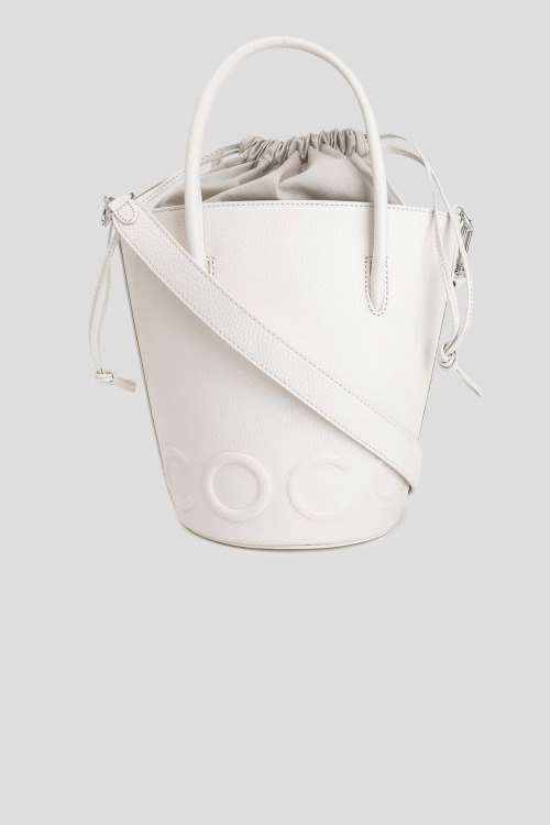 Детали: Женская белая кожаная сумка-ведро Myrtha от Coccinelle (Кочинелле). Модель из зернистой кожи, логотип в тон изделия, серебристая фурнитура, две круглые ручки, съемный плечевой ремень, текстильный мешок на затяжке, одно отделение. Размеры: 26 x 23 x 16 см