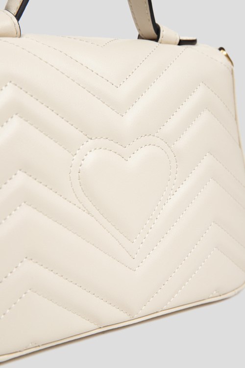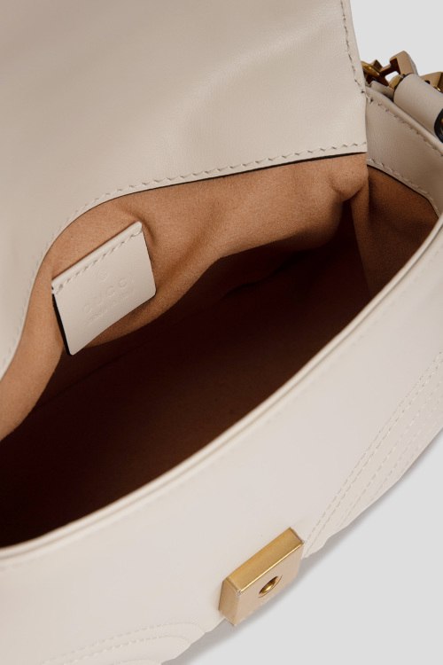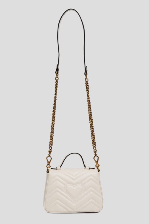 Женская белая сумка-тоут GG Marmont из натуральной кожи от Gucci (Гуччи). Стеганый дизайн, застежка с клапаном на магнит, верхняя ручка, одно отделение, металлическая фурнитура золотистого цвета, съемный плечевой ремень--цепочка, в комплекте пыльник, фирменная упаковка. Измерения: ширина - 18 см, высота - 15 см, глубина - 8 см