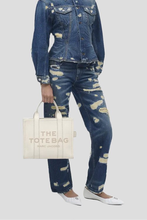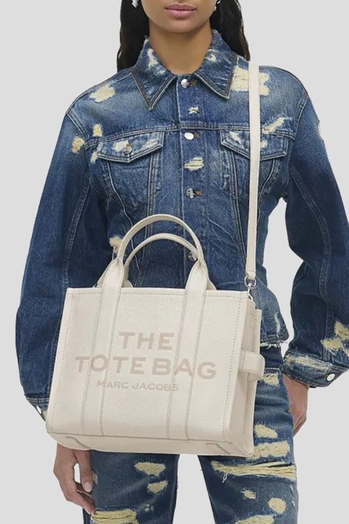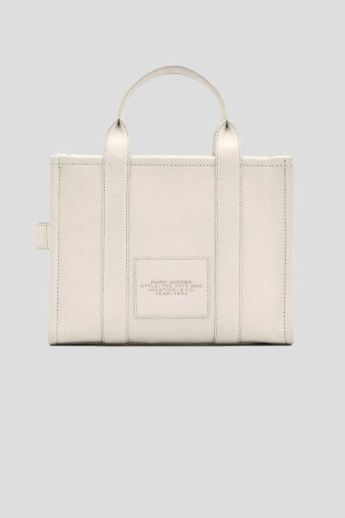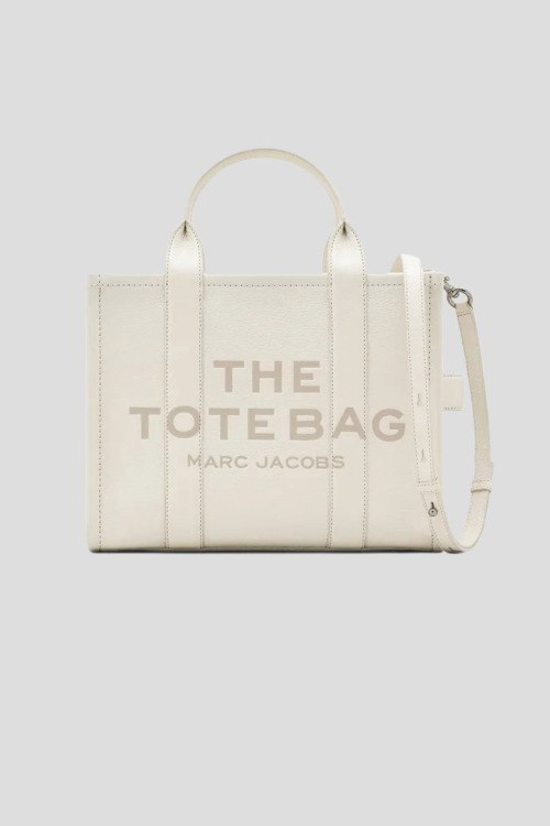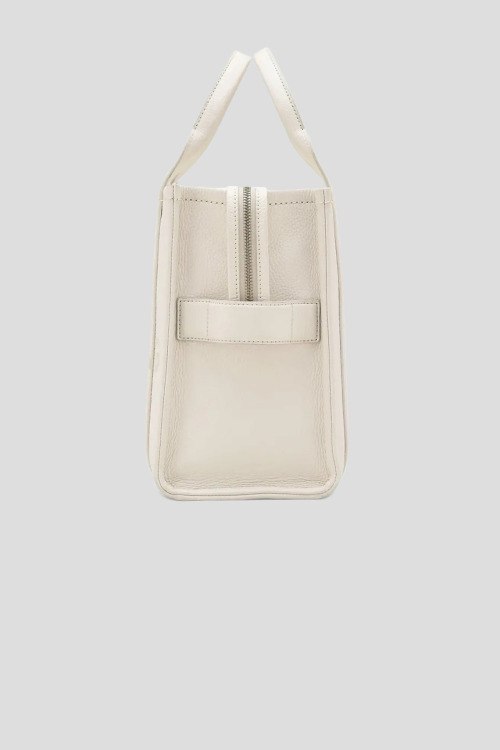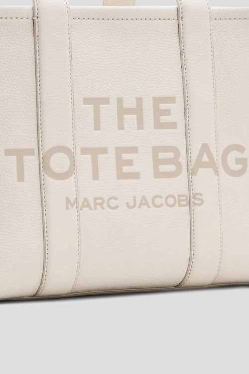 Детали: Женская белая кожаная сумка-тоут The Leather Medium от Marc Jacobs (Марк Джейкобс). Модель из зернистой кожи, принт с логотипом, серебристая фурнитура, две круглые ручки, съемный плечевой ремень, застежка-молния, одно отделение. Размеры: 34 x 15 x 27 см; высота ручек 12 см; максимальная длина плечевого ремня 144 см