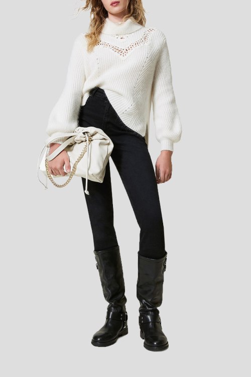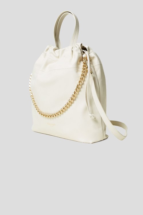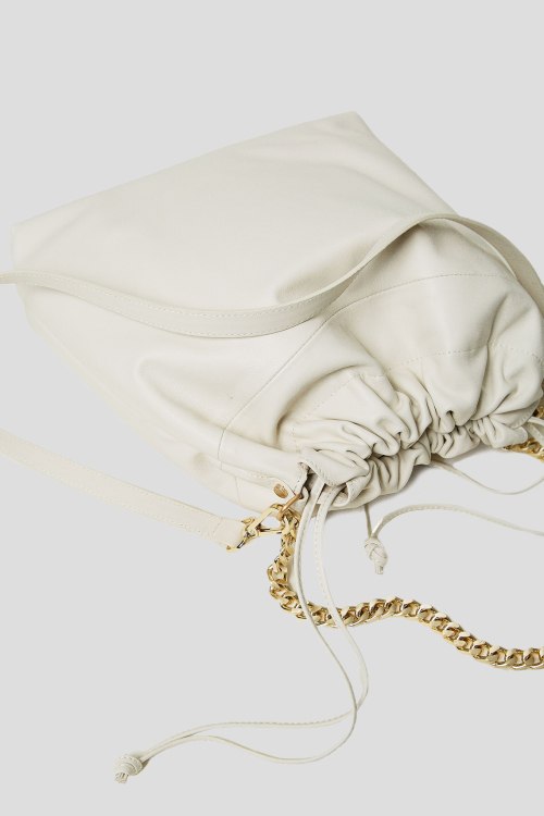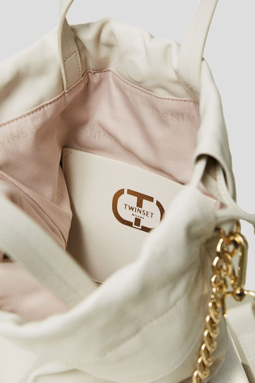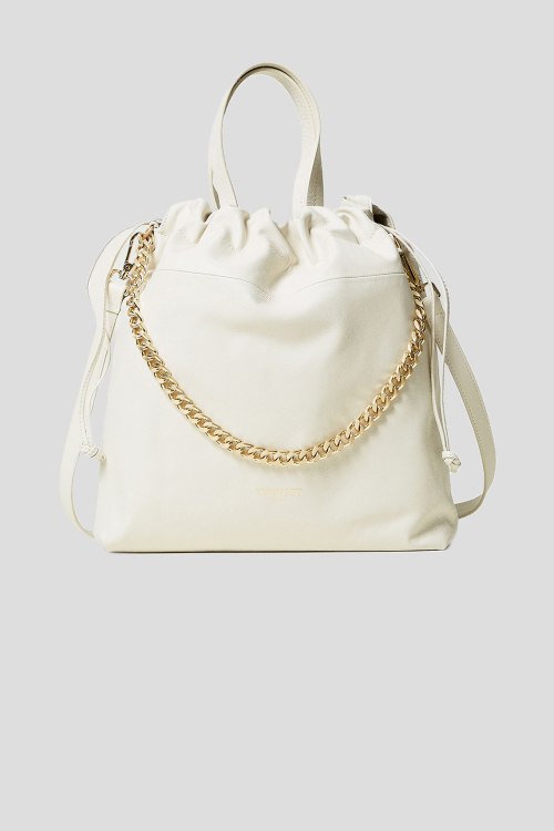 Детали: Женская белая кожаная сумка-мешок от TWINSET (Твинсет). Модель из гладкой кожи, крупная цепь, принт с логотипом, золотистая фурнитура, две ручки, верх на затяжках, одно отделение. Размеры: ширина 38 см, высота 35 см, глубина 8,5 см, высота ручки 12 см, длина плечевого ремня 54 см