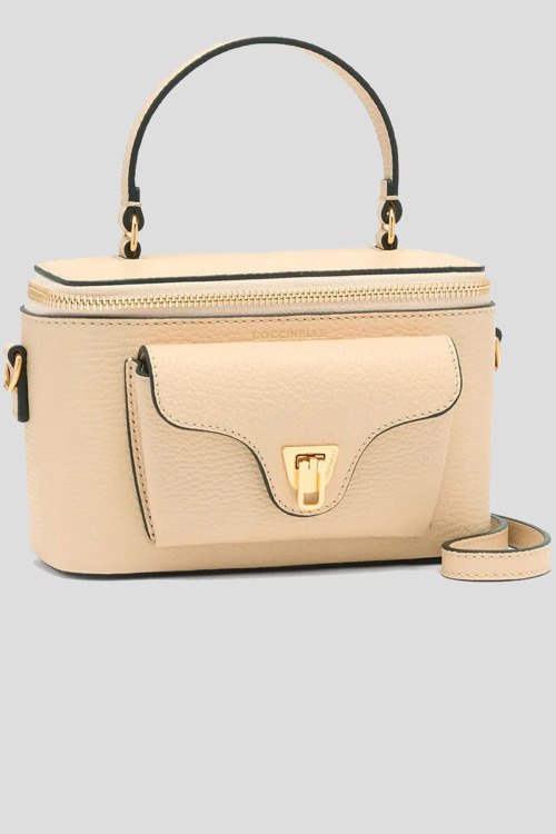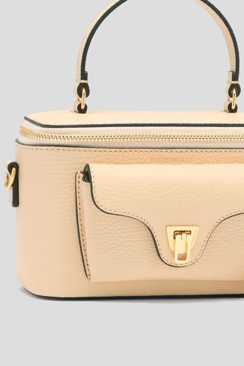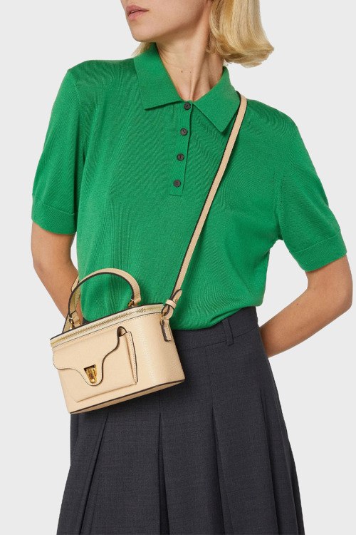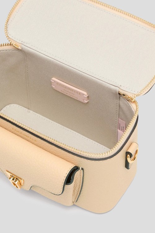 Детали: Женская светло-бежевая кожаная сумка-кейс Beat Generation от Coccinelle (Кочинелле). Модель из зернистой кожи, логотип спереди, золотистая фурнитура, накладной карман, круглая ручка, съемный плечевой ремень, застежка-молния, одно отделение. Размеры: 18 x 12 x 8 см