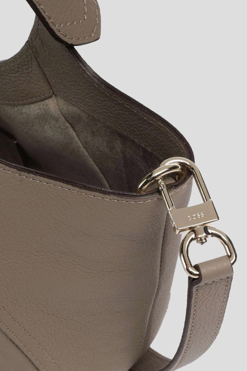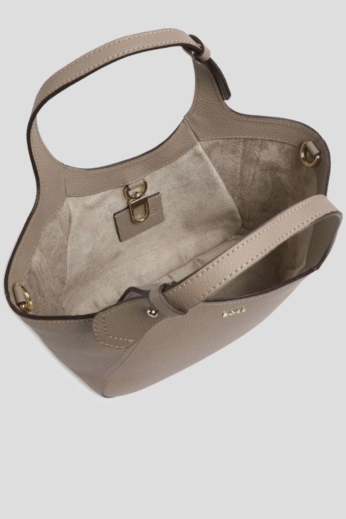 Детали: Женская бежевая сумка-тоут из натуральной кожи от Hugo Boss (Хуго Босс). Одно отделение, верхние ручки, съемный плечевой ремень, металлический логотип бренда. Размер: 34 x 18 x 9 см