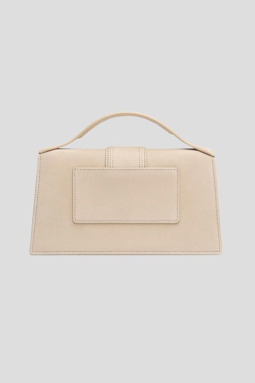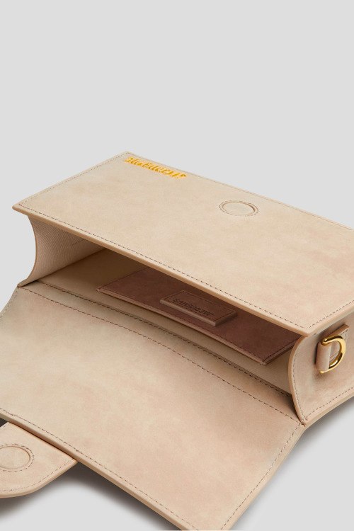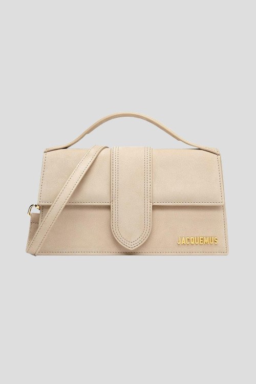 Детали: Женская светло-бежевая замшевая сумка-тоут Le Grand Bambino от Jacquemus (Жакмюс). Тональная строчка, золотистая фурнитура, значок с логотипом, накладной карман сзади, верхняя ручка, съемный плечевой ремень, застежка на магнит, одно отделение. Размеры: 23,5 см x 13 см
