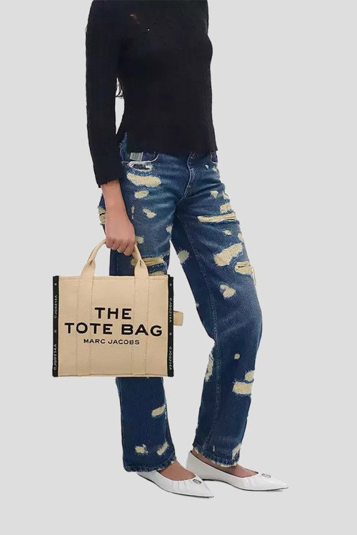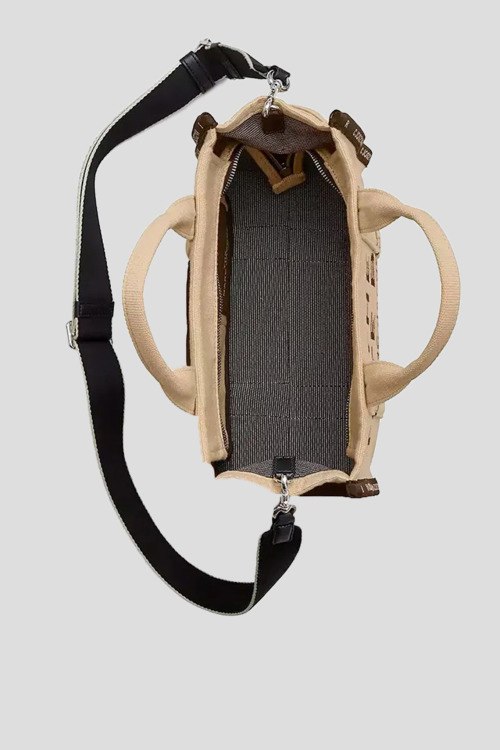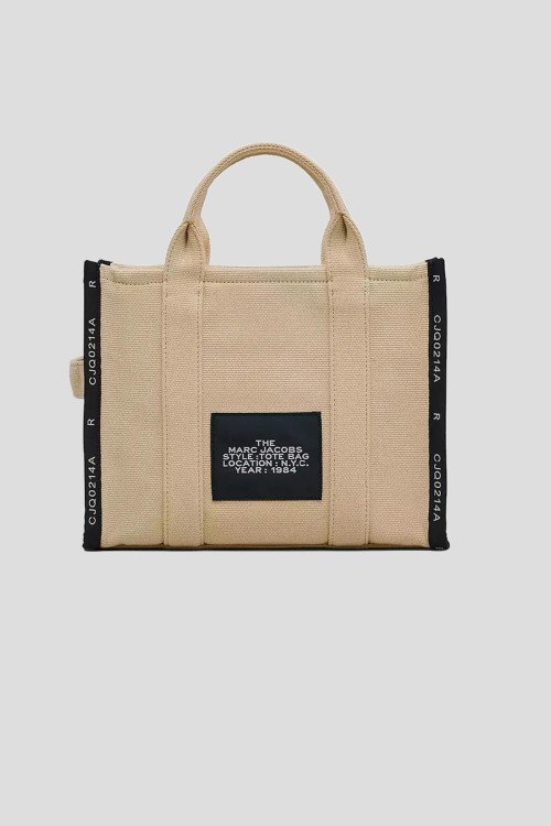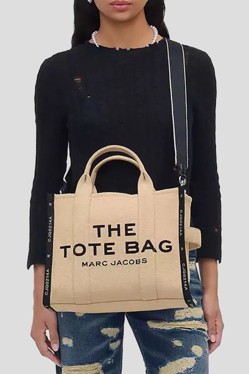 Детали: Женская бежевая текстильная сумка-тоут The Jacquard Medium от Marc Jacobs (Марк Джейкобс). Принт с логотипом, контрастная окантовка, серебристая фурнитура, две круглые ручки, съемный плечевой ремень, застежка-молния, одно отделение. Размеры: 34 x 15 x 27 см; высота ручек 12 см; максимальная длина плечевого ремня 144 см