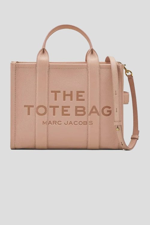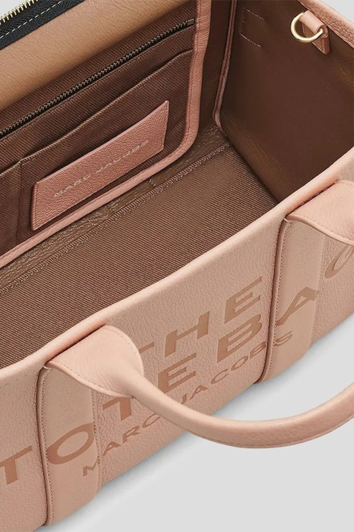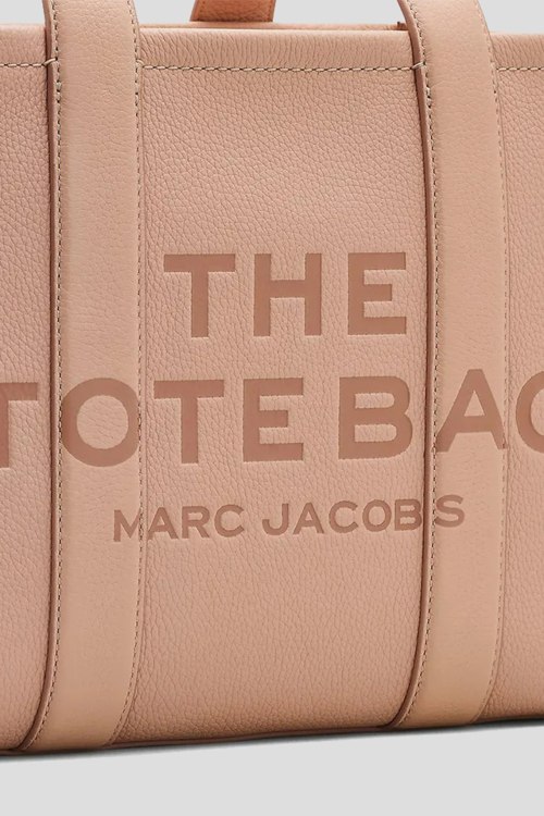 Детали: Женская бежевая кожаная сумка-тоут The Leather Medium Tote Bag от Marc Jacobs (Марк Джейкобс). Модель из зернистой кожи, тиснение логотипа, золотистая фурнитура, две круглые ручки, съемный плечевой ремень, застежка-молния, одно отделение. Размеры: 34 x 15 х 27 см