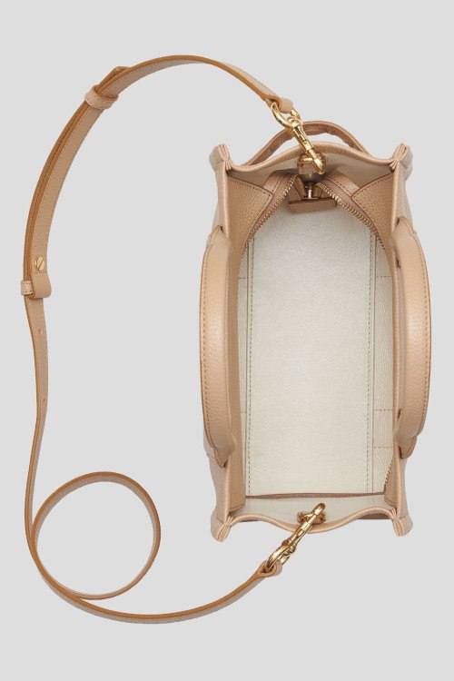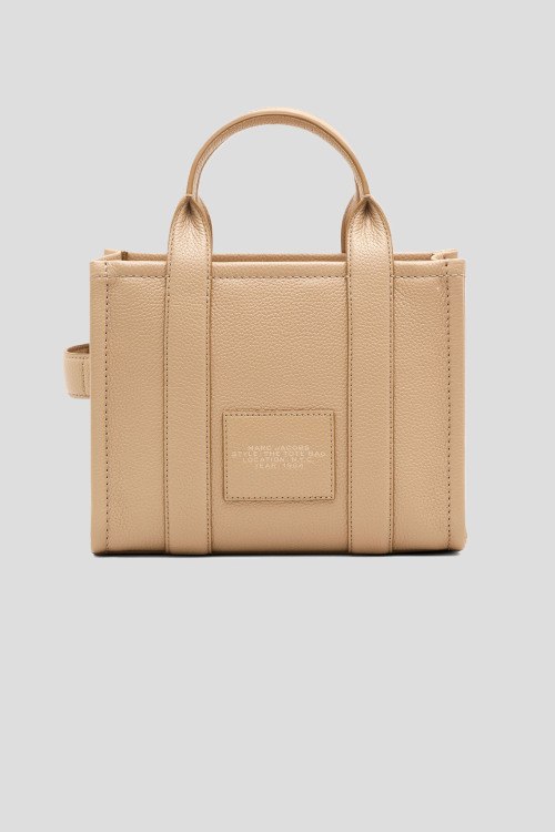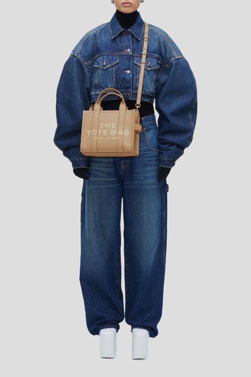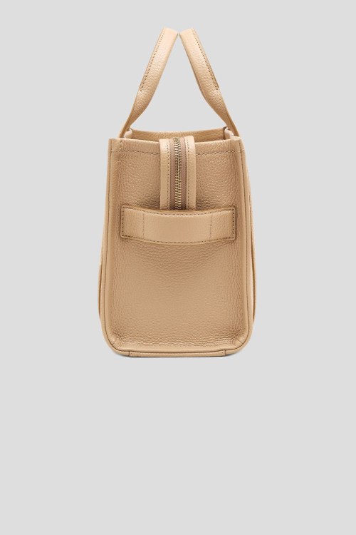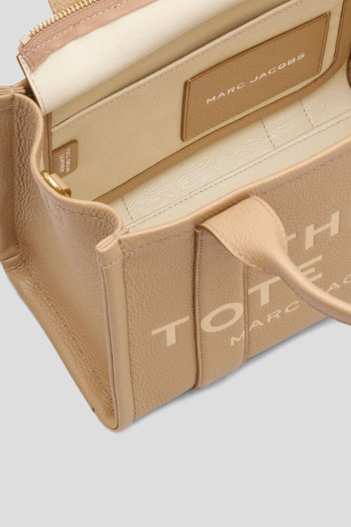 Детали: Женская бежевая кожаная сумка-тоут The Leather Small от Marc Jacobs (Марк Джейкобс). Модель из зернистой кожи, логотип спереди, нашивка с логотипом сзади, две круглые ручки, съемный плечевой ремень, золотистая фурнитура, застежка-молния, одно отделение, один внутренний карман. Размеры: глубина 12 см, ручка 10 см, высота 19 см, ремешок 65 см, ширина 26 см