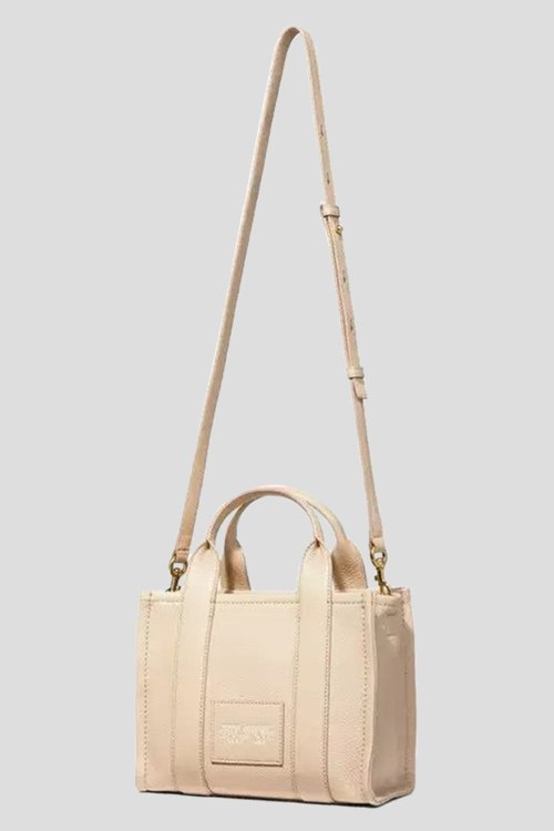 Женская бежевая сумка-тоут The Small Tote из натуральной кожи от Marc Jacobs (Марк Джейкобс). Одно отделение, застежка на молнию, внутренний карман на молнии, две ручки для носки в руках, съемный регулируемый плечевой ремень, логотип бренда. Измерения: 26 х 21 х 13 см, высота ручек: 11 см