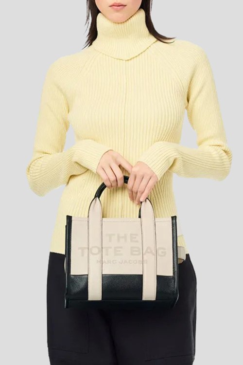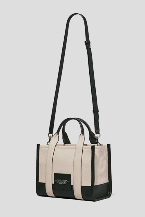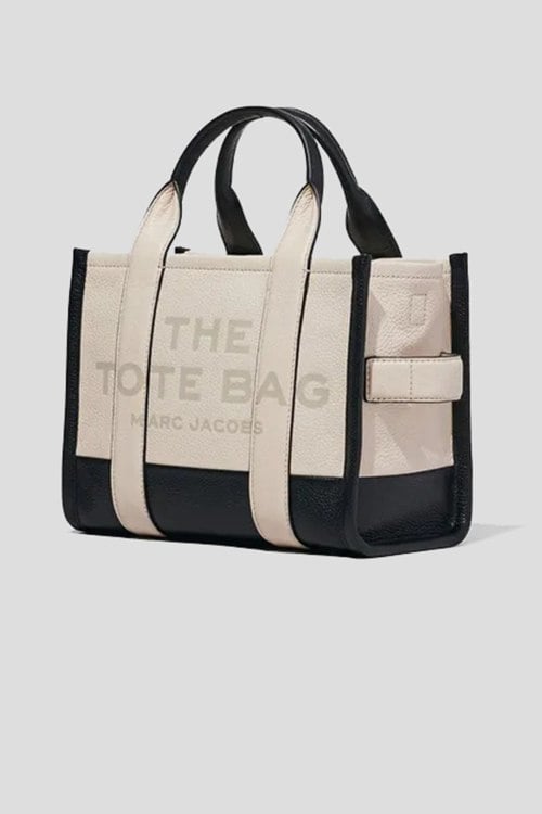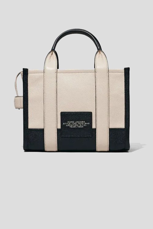 Детали: Женская бежевая сумка-тоут The Colorblock Small из натуральной кожи от Marc Jacobs (Марк Джейкобс). Принт с логотипом, контрастная окантовка, серебристая фурнитура, две круглые ручки, съемный плечевой ремень, застежка-молния, одно отделение. Размеры: 26 x 13 x 21 см; высота ручек 11 см; максимальная длина плечевого ремня 144 см