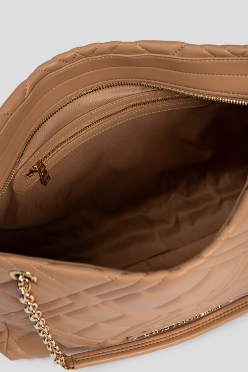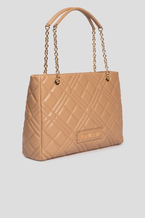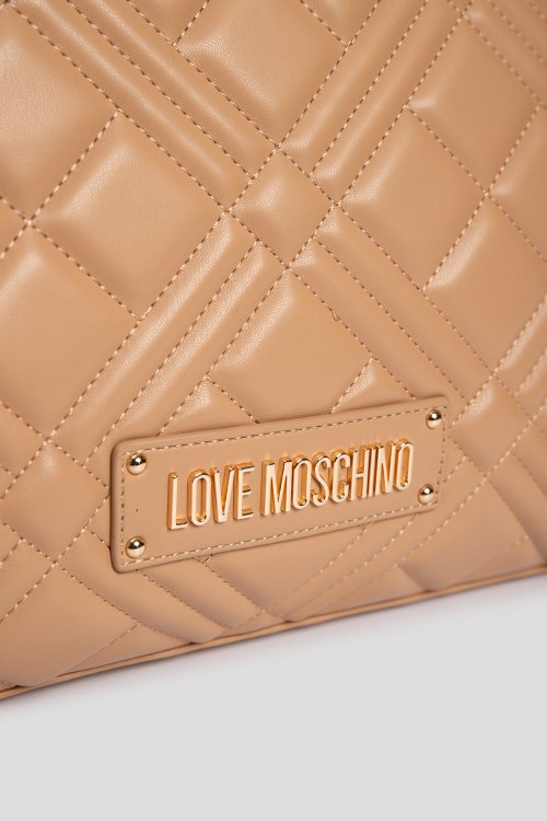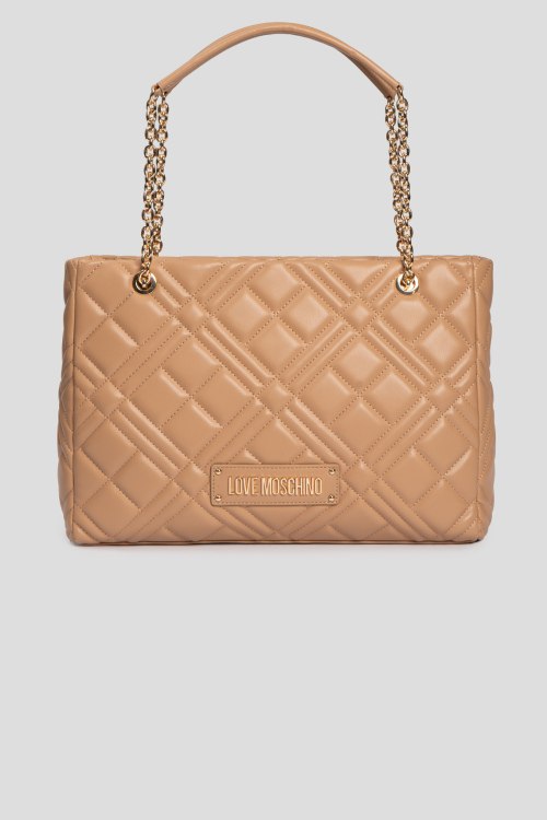 Детали: Женская бежевая сумка из полиуретана от Love Moschino (Лав Москино). Стеганый дизайн, одно отделение, застежка на молнию, внутренние карманы, две верхние ручки-цепочки, патч-лого. Размеры: 37 x 25 x 10 cм, высота ручек: 21 cм