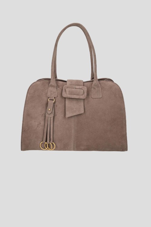 Детали: Женская бежевая замшевая сумка-тоут Rachel от Tosca Blu (Тоска Блу). Золотистая фурнитура, подвеска с кольцами, две круглые ручки, застежка на магнит, одно отделение. Размеры: 26 x 37 x 19 см