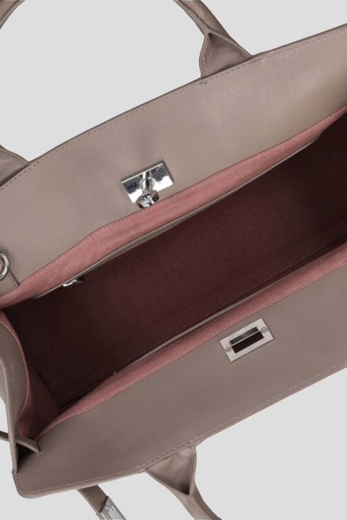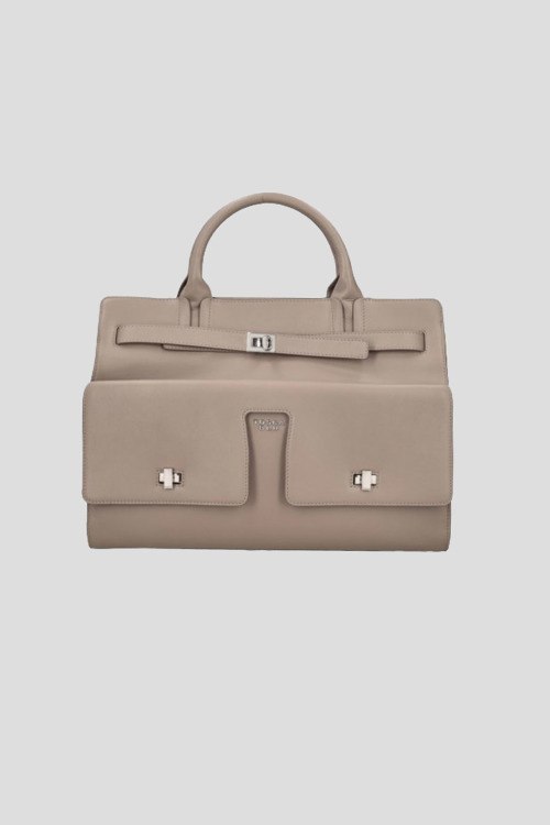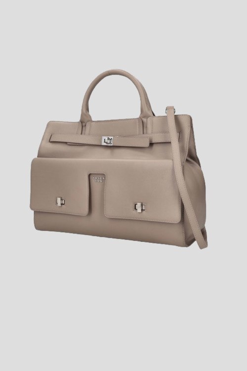 Детали: Женская бежевая кожаная сумка-тоут Zaira от Tosca Blu (Тоска Блу). Модель из гладкой кожи, серебристая фурнитура, значок логотипа, передний карман, две круглые ручки, съемный плечевой ремень, застежка на поворотный замок, одно отделение. Размеры: 28 х 36 х 15 см