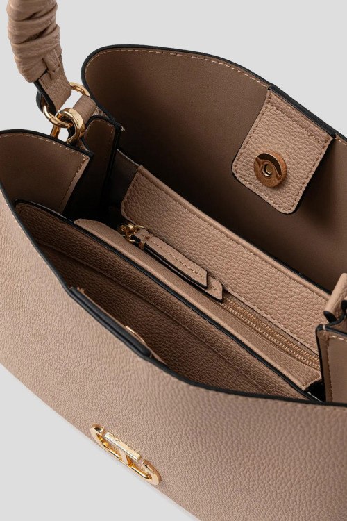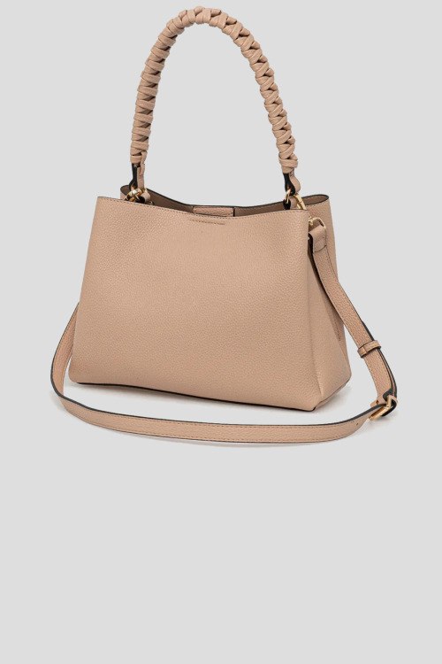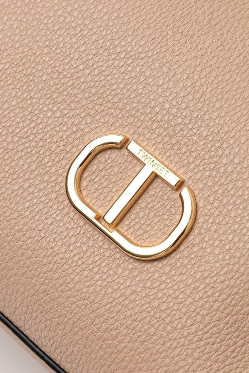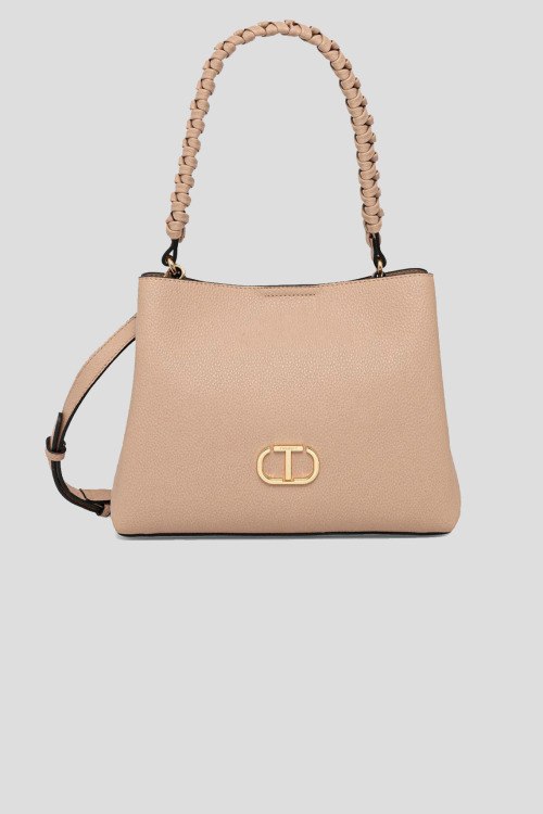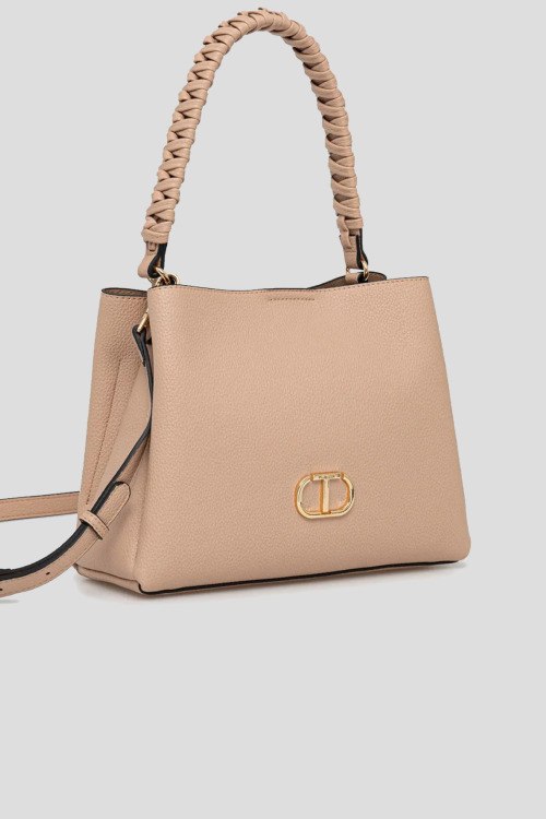 Детали: Женская бежевая сумка-тоут из экокожи от TWINSET (Твинсет). Модель из зернистой кожи, значок с логотипом, золотистая фурнитура, плетеная ручка, съемный плечевой ремень, застежка на магнит, три отделения. Размеры: 28 х 21 х 11 см
