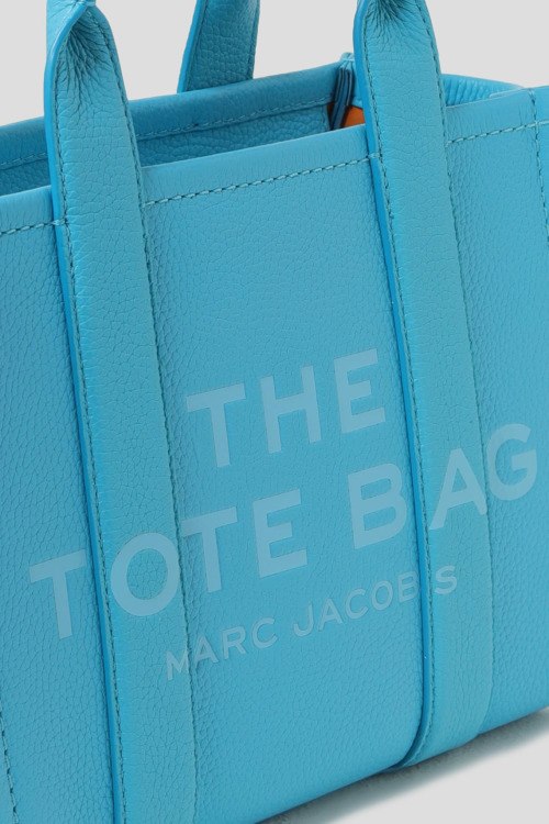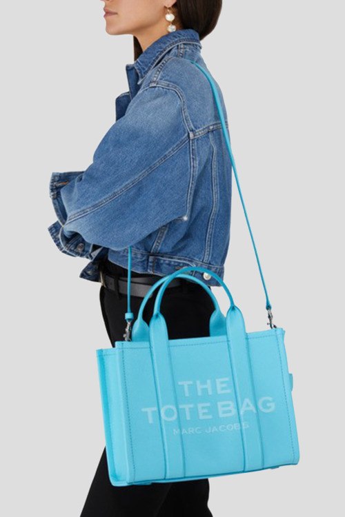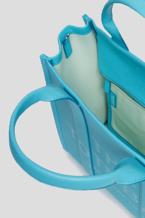 Детали: Женская бирюзовая сумка-тоут The Leather Medium Tote Bag из натуральной кожи от Marc Jacobs (Марк Джейкобс). Принт с логотипом, контрастная окантовка, серебристая фурнитура, две круглые ручки, съемный плечевой ремень, застежка-молния, одно отделение. Размеры: 26 x 13 x 21 см; высота ручек 11 см; максимальная длина плечевого ремня 144 см