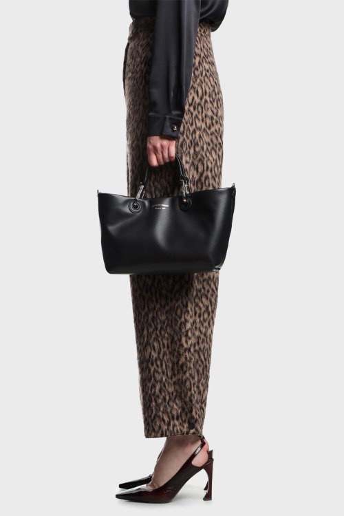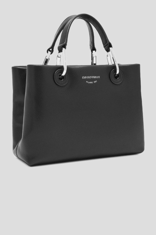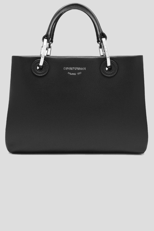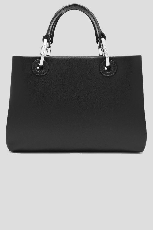 Детали: Женская черная кожаная сумка-тоут от Emporio Armani (Эмпорио Армани). Модель из гладкой кожи, принт логотипа, серебристая фурнитура, внутренний кошелек, две круглые ручки, съемный плечевой ремень, застежка на магнит, одно отделение. Размеры: высота: 20 см, длина: 28 см, ширина: 10 см