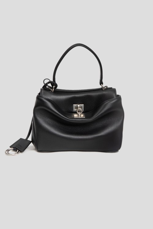 Женская черная кожаная сумка-тоут Rodeo MIni от Balenciaga (Баленсиага). Модель из гладкой кожи, фурнитура из состаренного серебра, съемный клош-кле с двумя разъемными кольцами, застежка на поворотный замок, широкий передний карман, 4 латунные ножки, 2 плоских кармана сзади, 1 основное отделение, 1 внутренний карман на молнии, подкладка из кожи ягненка наппа. Комплектация: коробка, пыльник, пакет. Размеры: ширина 24 см, высота 19 см, глубина 8,5 см