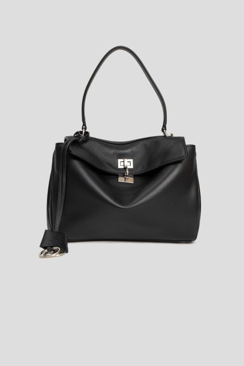 Женская черная кожаная сумка-тоут Rodeo Small от Balenciaga (Баленсиага). Модель из гладкой кожи, серебристая фурнитура, верхняя ручка, съемный плечевой ремень, подвеска с брелком, застежка на поворотный замок, два отделения, внутренний карман на молнии. Комплектация: коробка и пыльник. Размеры: ширина: 27 см, высота: 21 см, глубина: 10 см, длина плечевого ремня 119 см