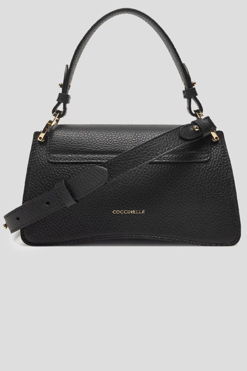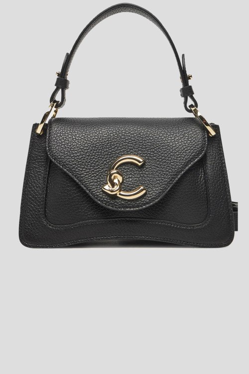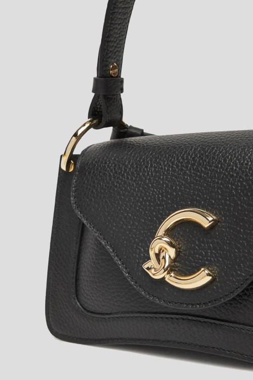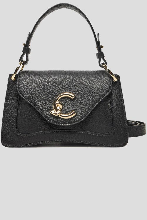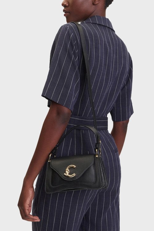 Детали: Женская черная кожаная сумка-тоут C-Me от Coccinelle (Кочинелле). Модель из зернистой кожи, значок логотипа, золотистая фурнитура, круглая ручка, съемный плечевой ремень, застежка на магнит, одно отделение. Размеры: 21 x 12 x 9 см
