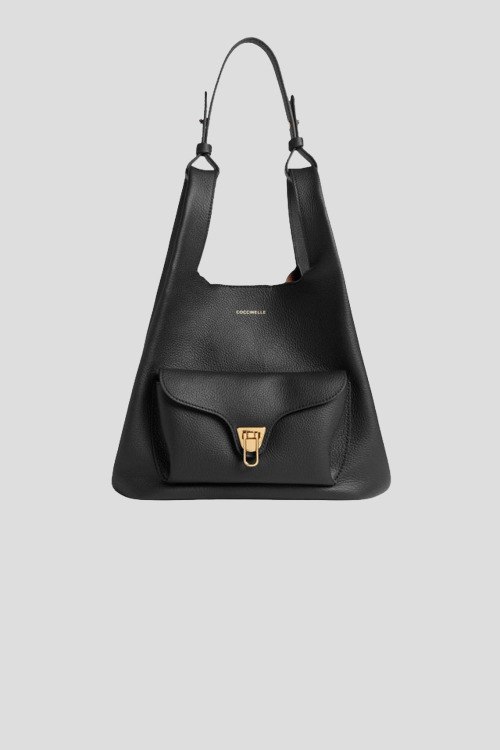 Детали: Женская черная кожаная сумка-тоут Beat от Coccinelle (Кочинелле). Модель из зернистой кожи, логотип спереди, золотистая фурнитура, отстегивающийся карман-клапан, застежка на магнит, две ручки, одно отделение