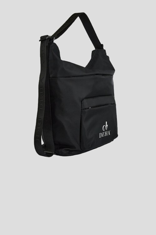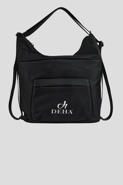 Детали: Женская черная текстильная сумка-тоут от Deha (Деха). Принт с логотипом, накладной карман на молнии, два плечевых ремня, застежка-молния, одно отделение