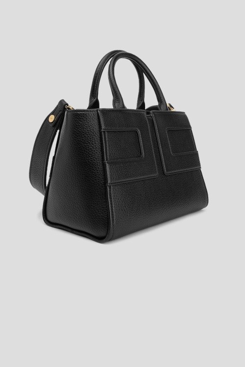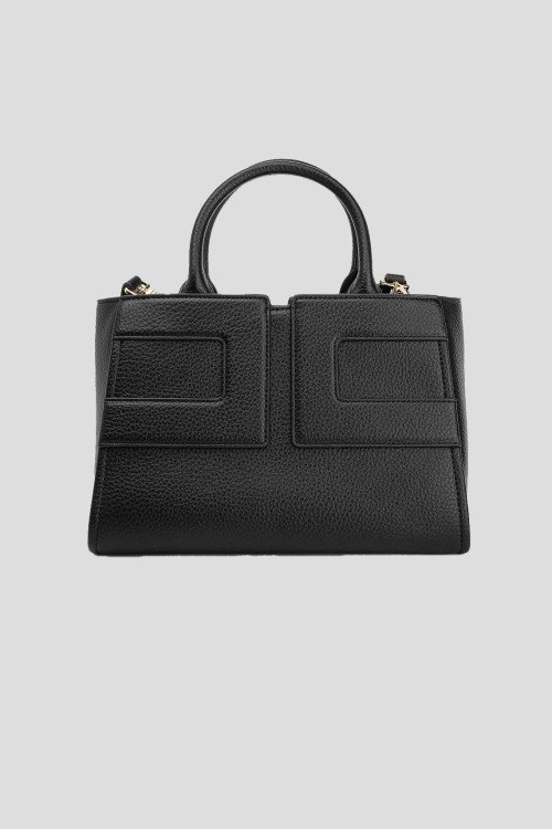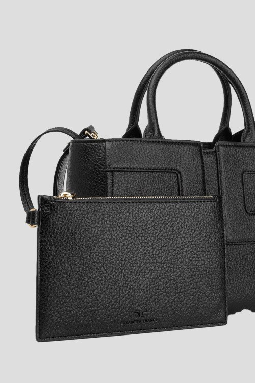 Детали: Женская черная сумка-тоут из экокожи от Elisabetta Franchi (Елизабетта Франчи). Модель из зернистой кожи, золотистая фурнитура, застежка-молния, внутренний кошелек, две круглые ручки, съемный плечевой ремень, одно отделение. Размеры: 19 x 28 x 16 см