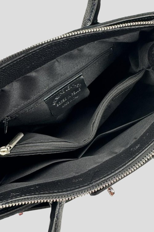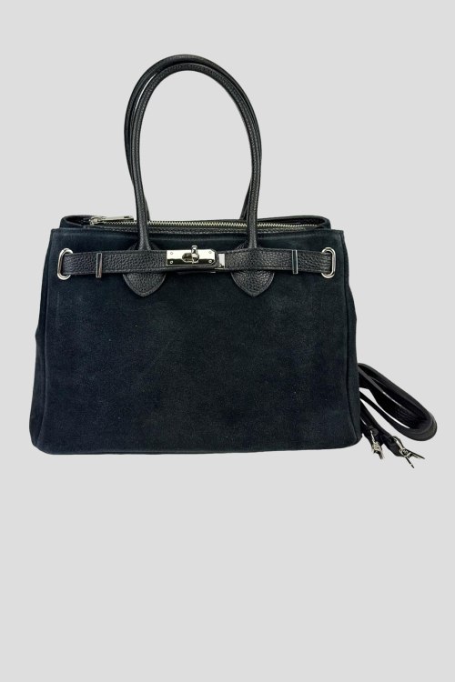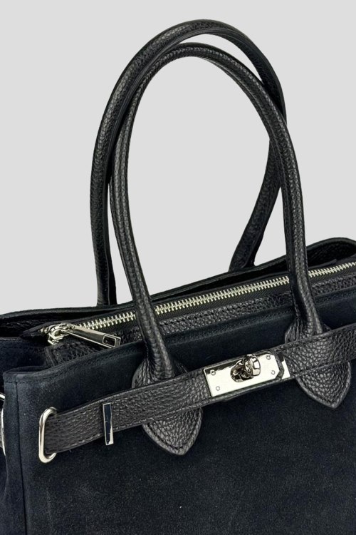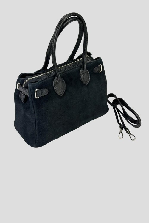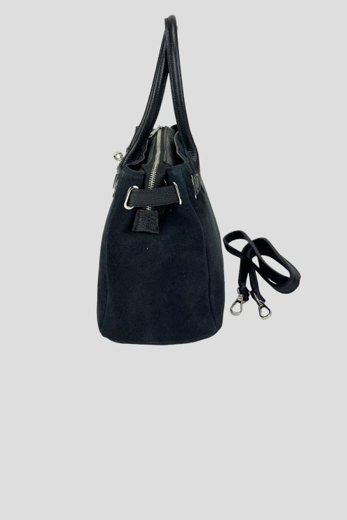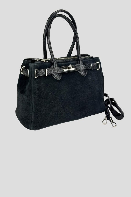 Женская черная сумка-тоут из натуральной замши от Firenze Italy (Фирензе Итали). Два отделения, застежка на молнию, внутренние карманы на молнии, две верхние ручки, съемный плечевой ремень, металлические ножки. Измерения:30(28) x 21 x 13 см. Длина ручок - 30 см, Высота от сумки до середины ручок - 16 см