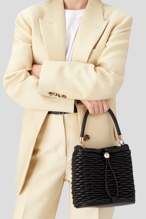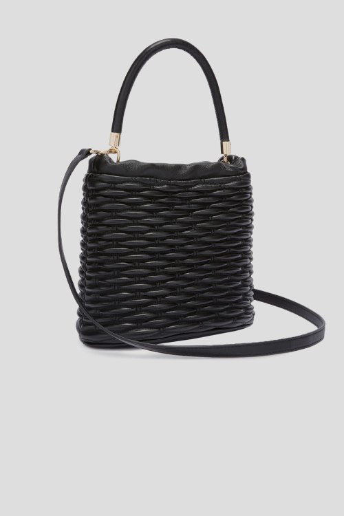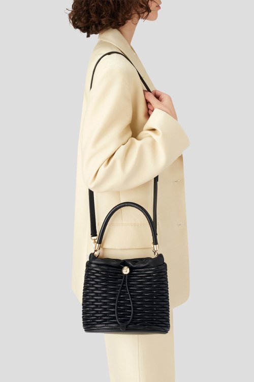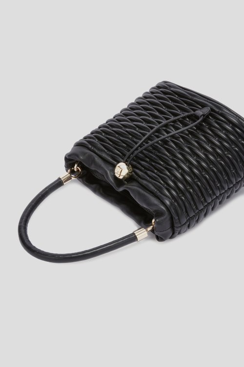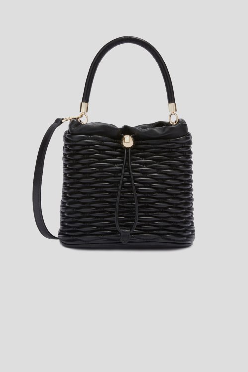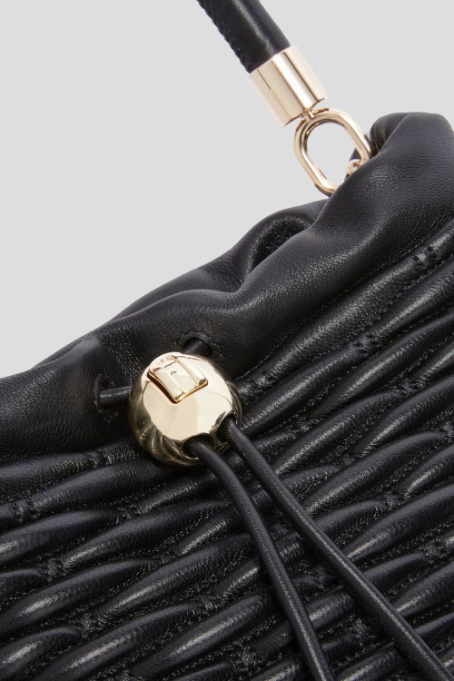 Детали: Женская черная кожаная сумка ведро Mionido Mini Bucket от Furla (Фурла). Модель из гладкой кожи, стеганый дизайн, золотистая фурнитура, верх на затяжке, одна круглая ручка, съемный плечевой ремень, застежка-молния, одно отделение. Размеры: 21 x 22 x 13,5 см