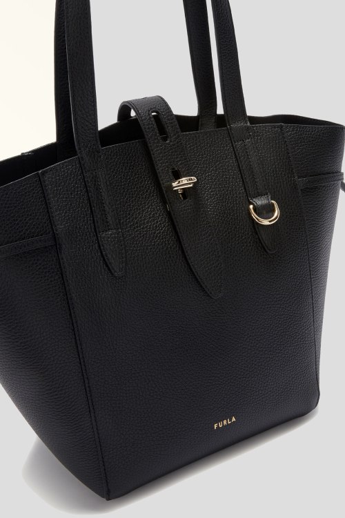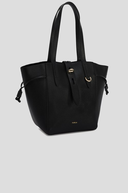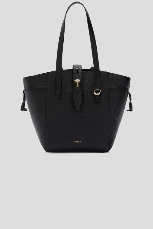 Женская черная кожаная сумка-тоут Net от Furla (Фурла). Модель из зернистой кожи, логотип спереди, золотистая фурнитура, две ручки, одно отделение. Размеры: 22 x 28,5 x 16 см