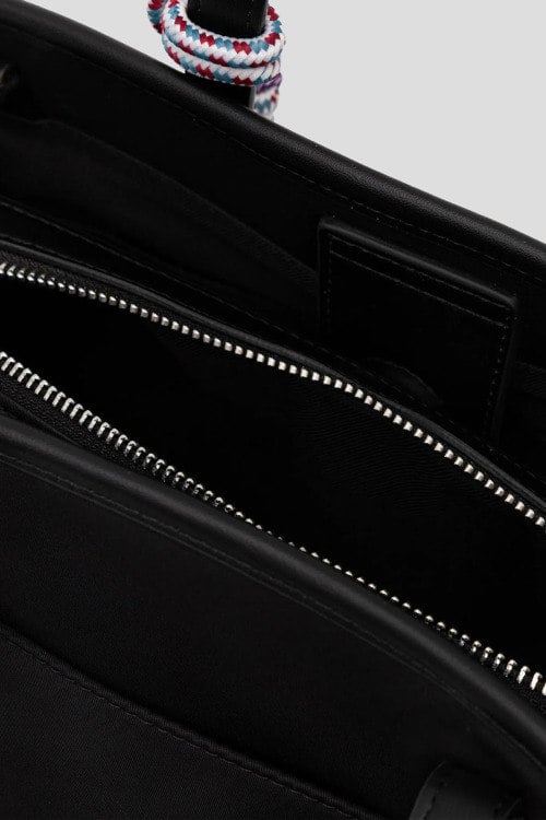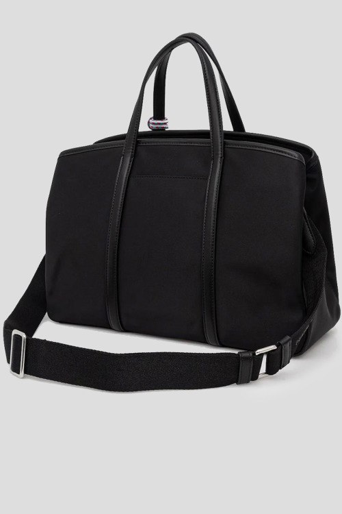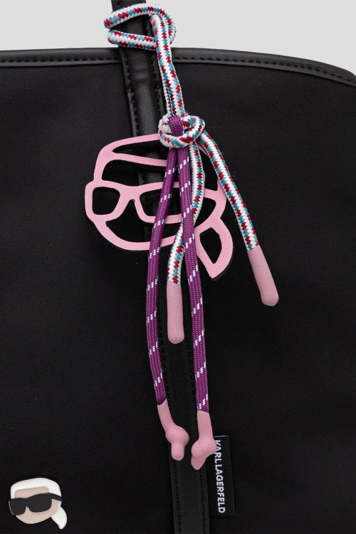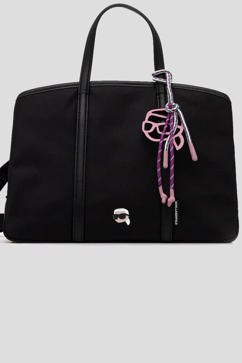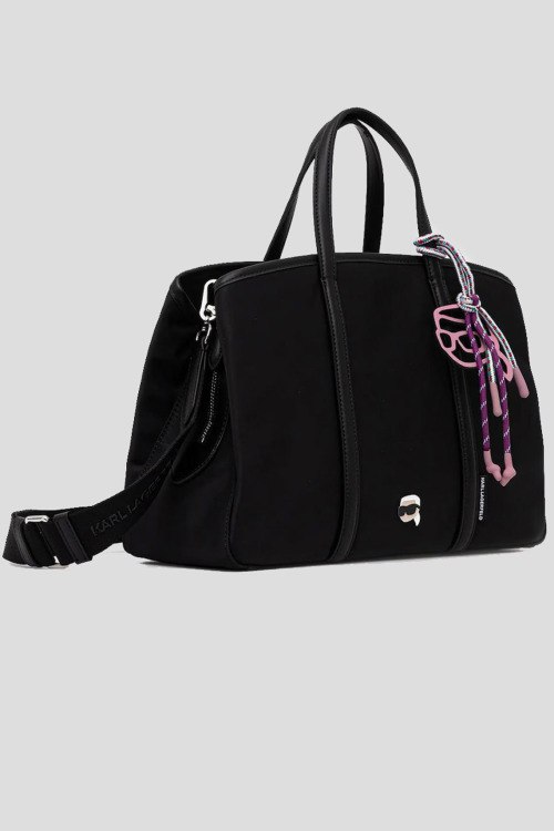 Детали: Женская черная текстильная сумка-тоут от Karl Lagerfeld (Карл Лагерфельд). Нашивка и подвеска с логотипом, серебристая фурнитура, две круглые ручки, съемный плечевой ремень, застежка-молния, одно отделение. Размеры: 25 x 22 x 13 см