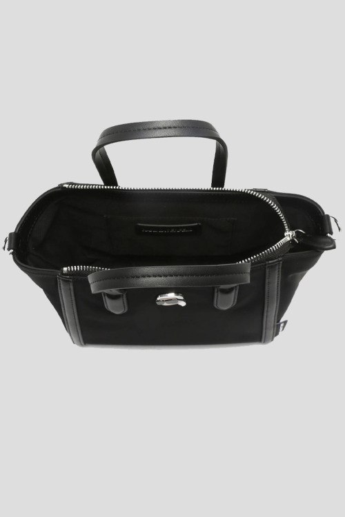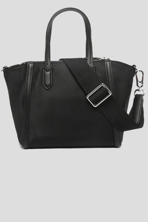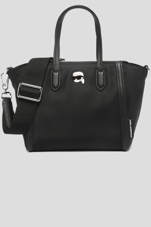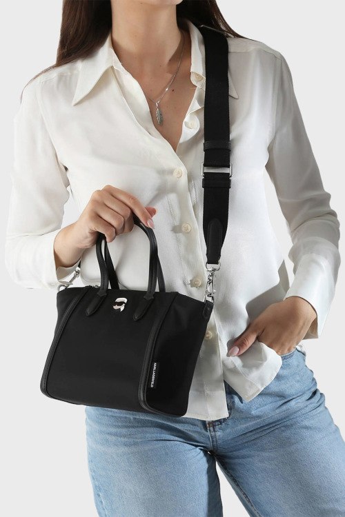 Детали: Женская черная нейлоновая сумка-тоут Ikon от Karl Lagerfeld (Карл Лагерфельд). Нашивка с логотипом, серебристая фурнитура, две круглые ручки, съемный плечевой ремень, застежка-молния, одно отделение. Размеры: 29 х 18,5 х 10,5 см