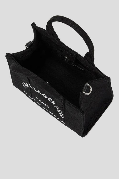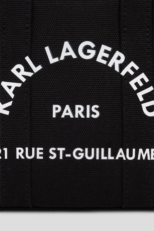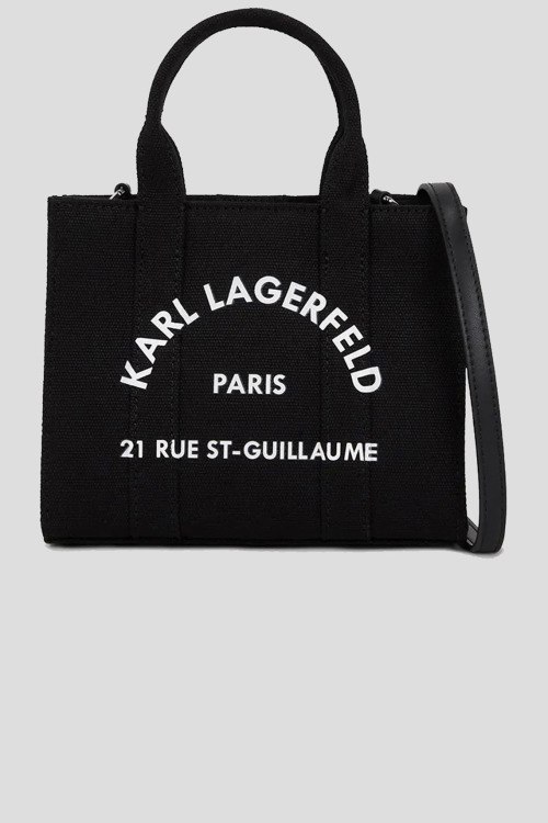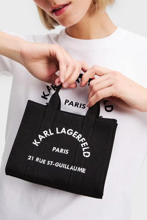 Детали: Женская черная текстильная сумка-тоут K/Rue St Guillaume Mini от Karl Lagerfeld (Карл Лагерфельд). Принт с логотипом, серебристая фурнитура, две круглые ручки, съемный плечевой ремень, застежка на магнит, одно отделение. Размеры: 18,5 х 15 х 10,5 см