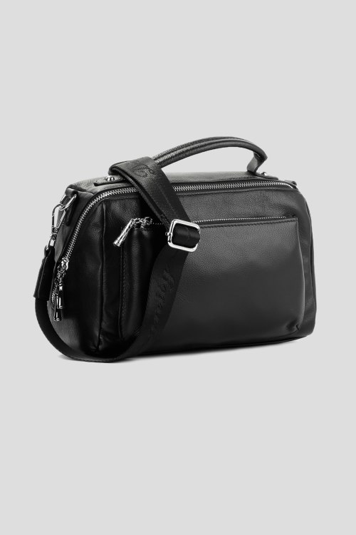 Детали: Женская черная кожаная сумка-тоут от Le Berdes (Ле Бердес). Внутри одно основное отделение, есть три внутренних и два внешних кармана, застежка на молнию, верхняя ручка, длина плечевого ремня: 124 см (регулируется). Размер: 26х16х11 см