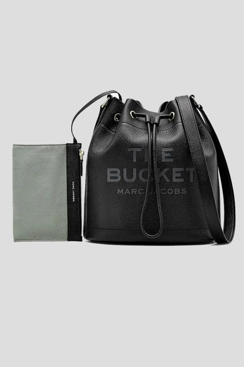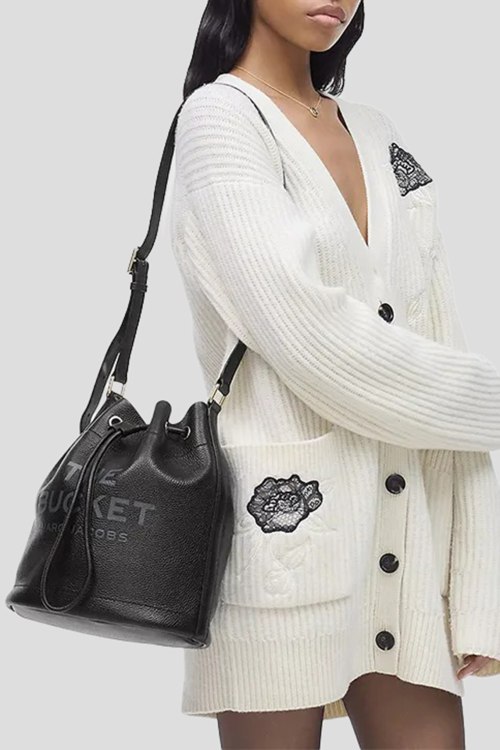 Детали: Женская черная кожаная сумка-мешок The Shoulder Bucket Large от Marc Jacobs (Марк Джейкобс). Модель из зернистой кожи, тиснение логотипа, золотистая фурнитура, внутренний кошелек, регулируемый плечевой ремень, верх на затяжке, одно отделение. Размеры: 29 x 19 х 30 см